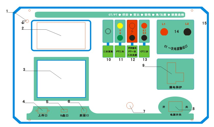 11.PT 二次输入口   12.交流电压/负载测试输出口    13.CT 二次输入口
