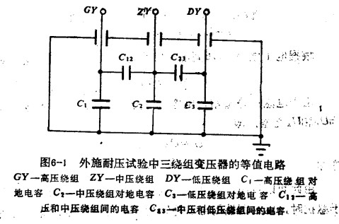 变压器一般由两个以上的绕组组成,每个绕组对地都有绝缘,相邻的两个绕组也有绝缘,这样就可以将每个绕组看成是电容器的一个极板,接地部分看成电容器的另一个极板。一台三绕组变压器的等值电路,如图6-1所示。